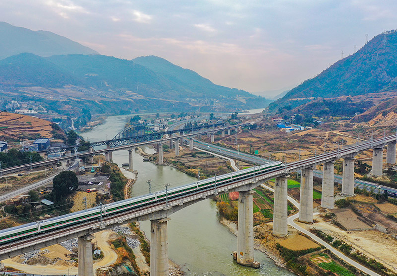 2022年12月26日,蜿蜒千里的新成昆铁路全线贯通运营。复兴号动车组从成都南站发出,沿着现代化的铁路,奔驰在崇山峻岭间。